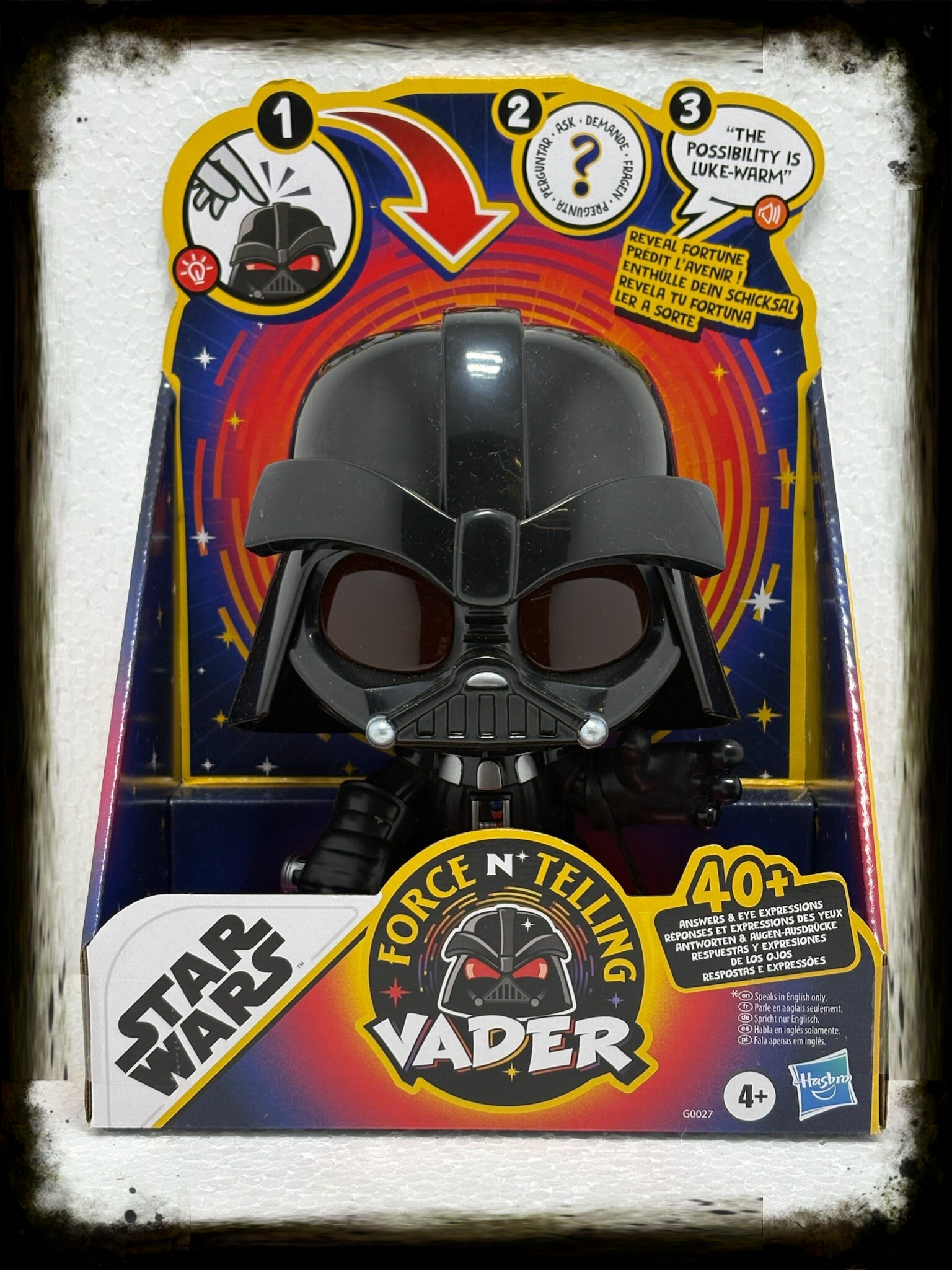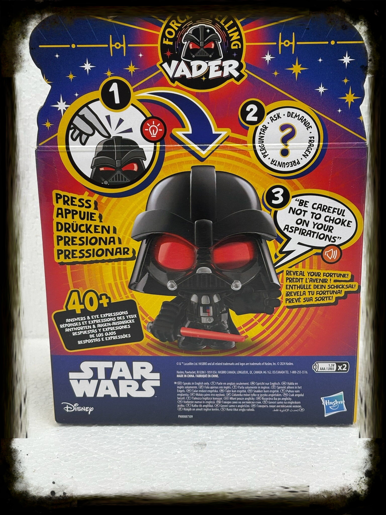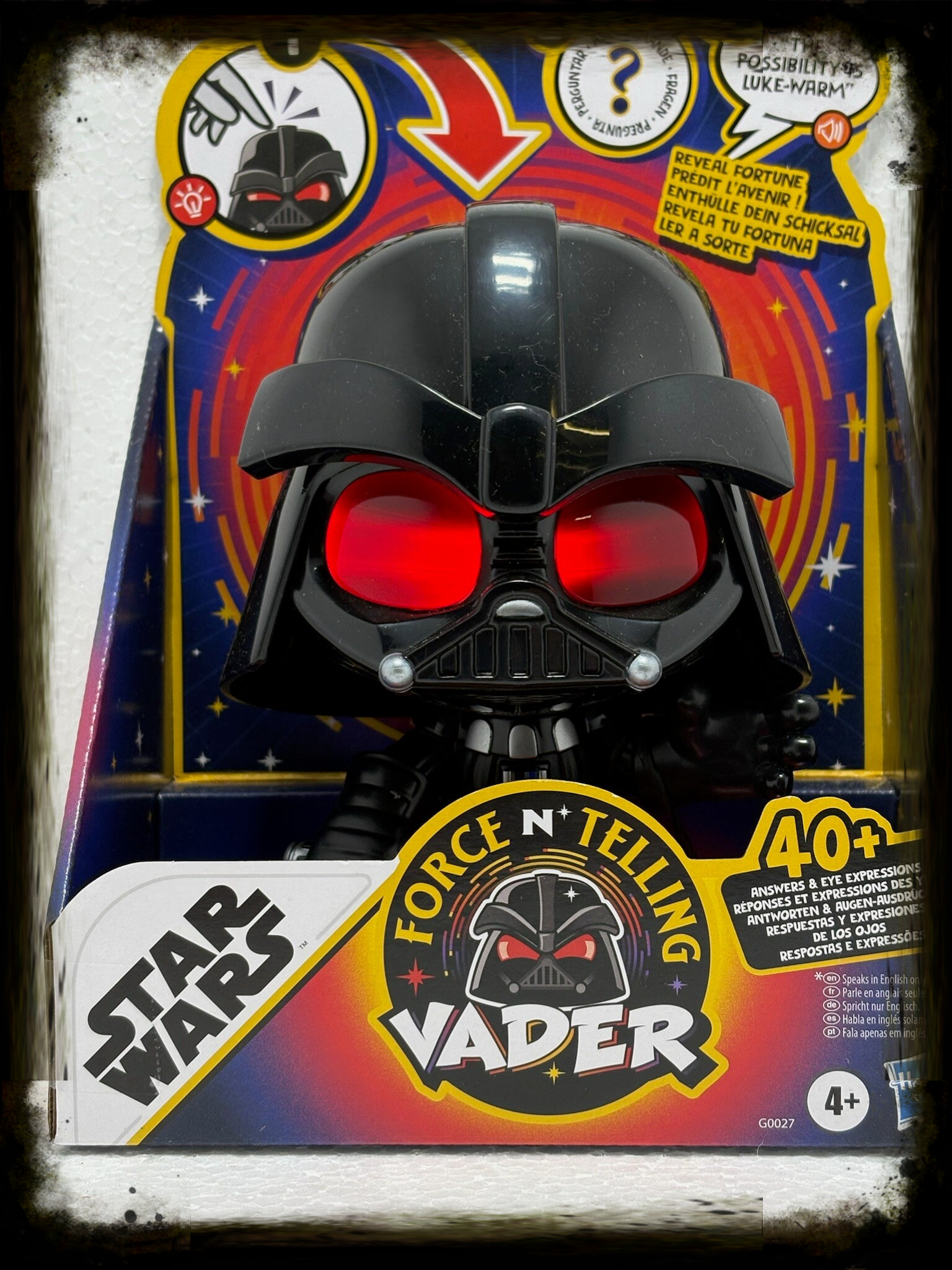 Deze unieke figure reageert op aanraking en geeft meer dan 40 verschillende zinnen en voorspellingen, uitgesproken in het Engels. De ogen veranderen van expressie en lichten op terwijl Vader zijn “kennis van de Force” met je deelt.