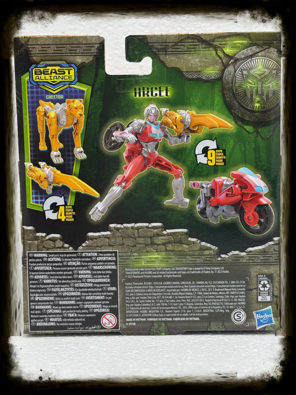 Een Arcee-actiefiguur die in 9 stappen transformeert van robot naar motorfietsmodus.